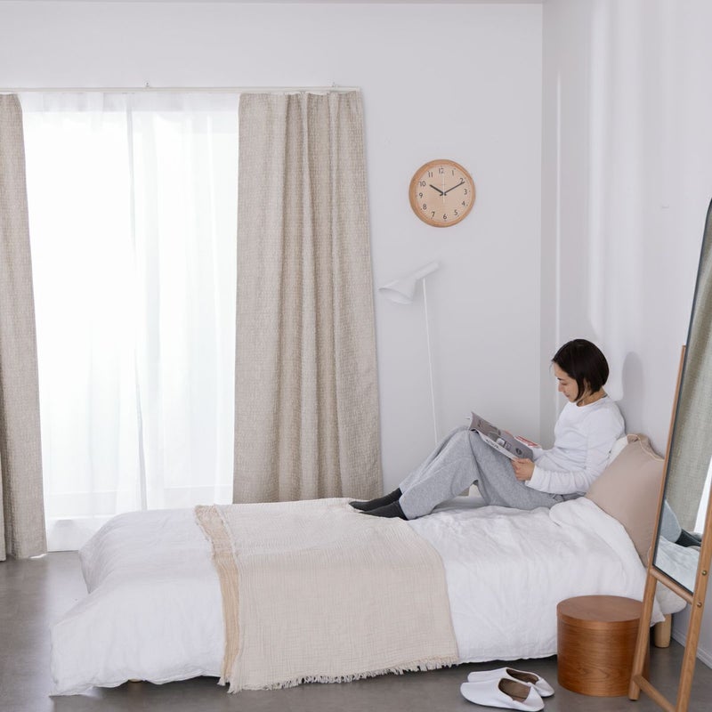 シンプルなデザインながら、落ち着いた生地感で、ナチュラルなお部屋にすっとなじむ一枚。 賃貸のお部屋や一人暮らしの空間にも取り入れやすく、機能と見た目のバランスを大切にしたカーテンです。