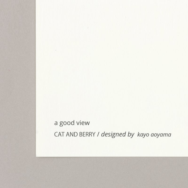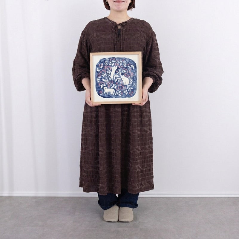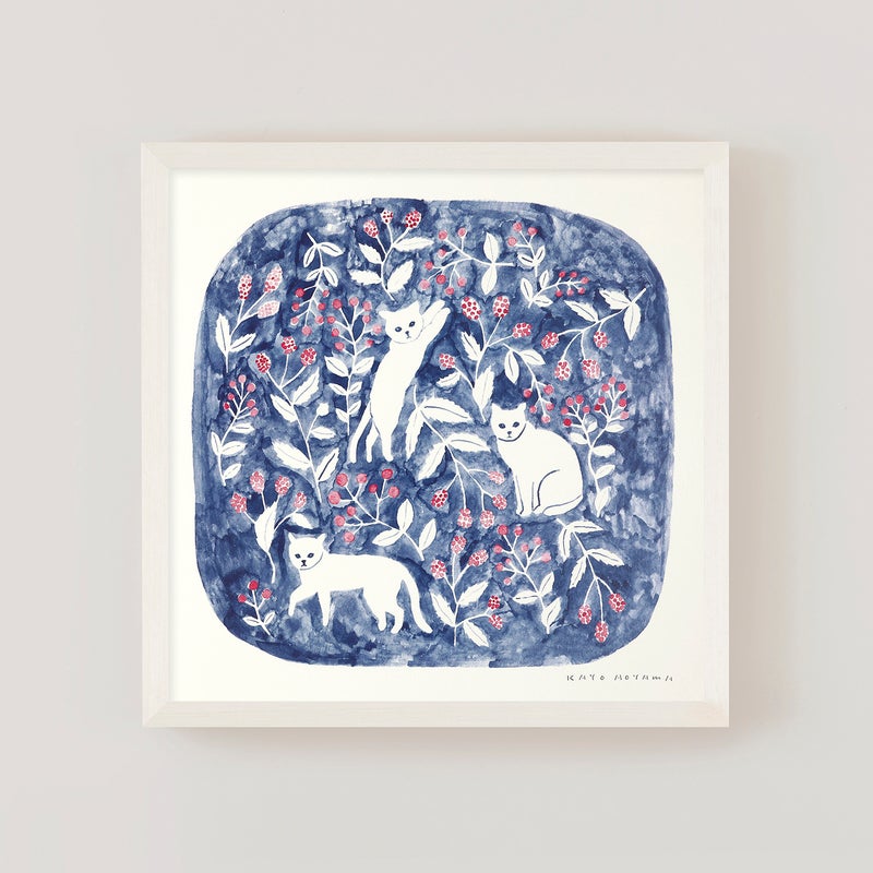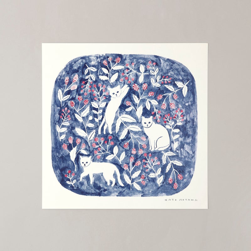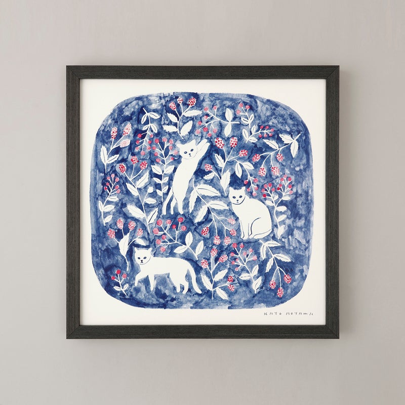 深みのあるブルーを背景に、白い猫と赤い実をつけた植物がやさしく描かれた作品。 どこか物語の中のような世界観が広がり、見るたびに静かな余韻を感じさせてくれます。