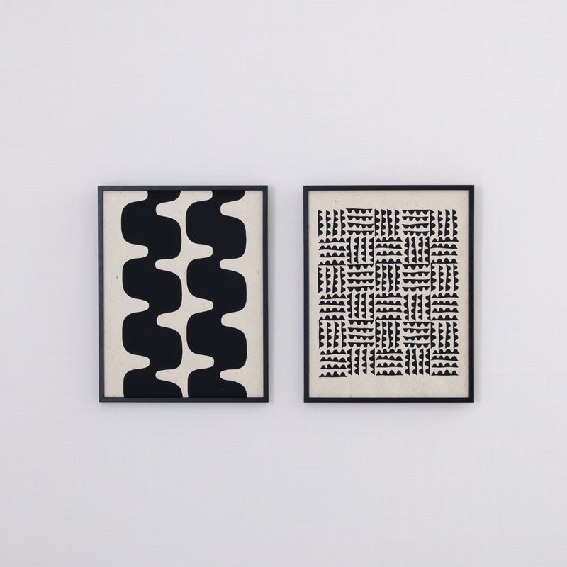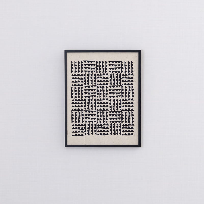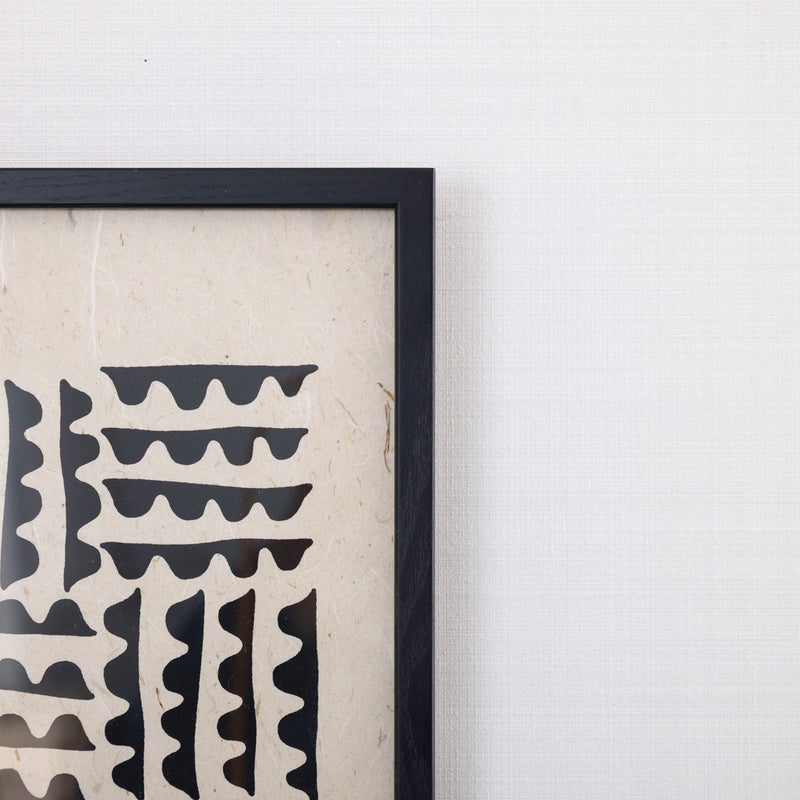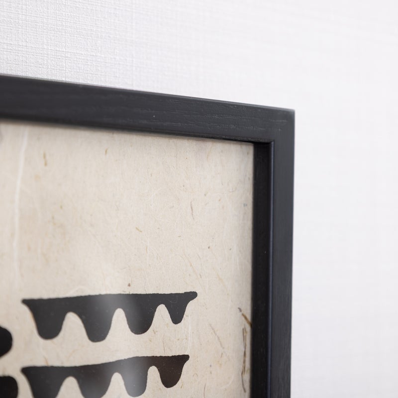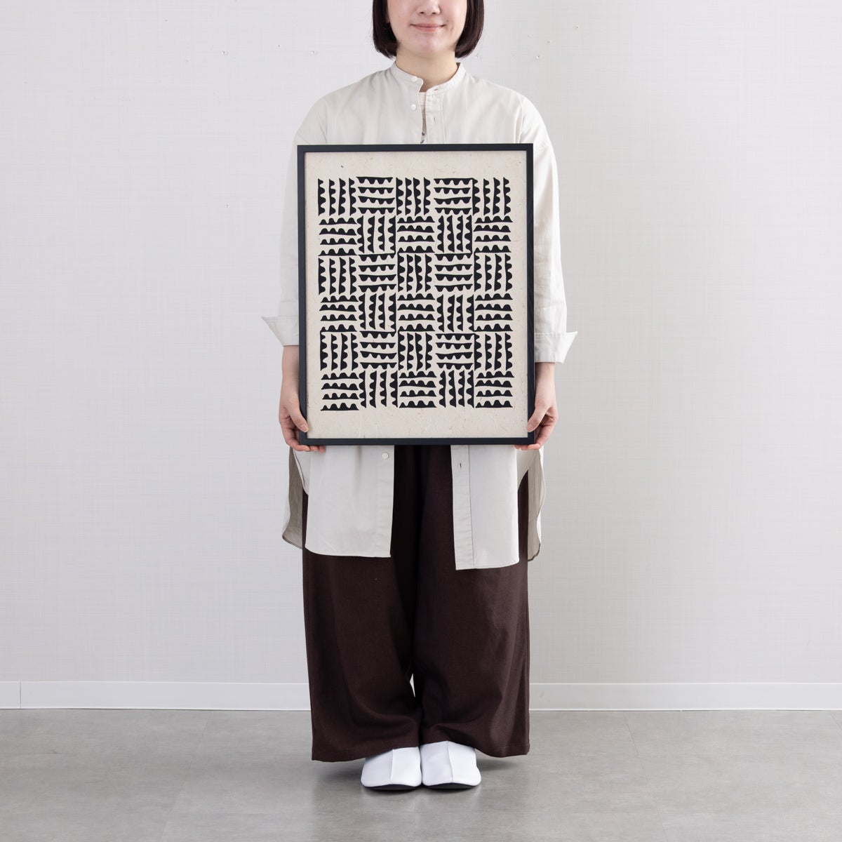 広瀬和紙に、シルクスクリーンで描いた幾何学模様。 うねりや重なりのある線が、空間に静かなリズムを生み出します。 生成りのやさしい風合いと、黒のコントラストが、主張しすぎず、そっと空間になじむアートです。 アートポスターとフレームがセットになっています。