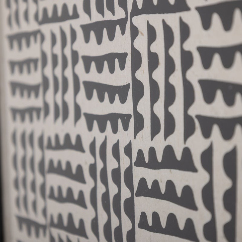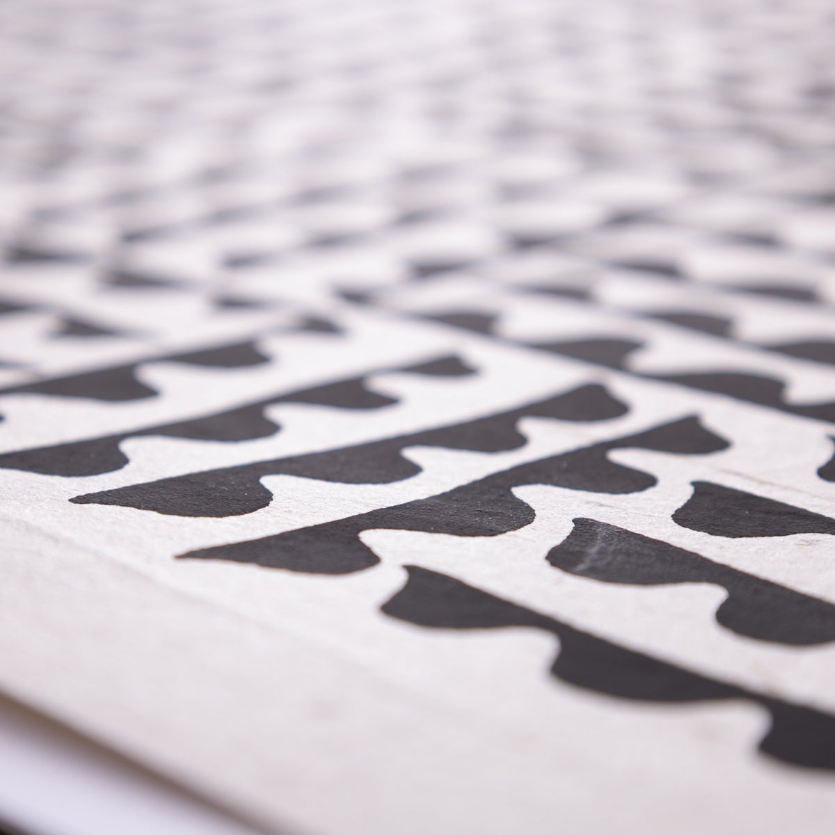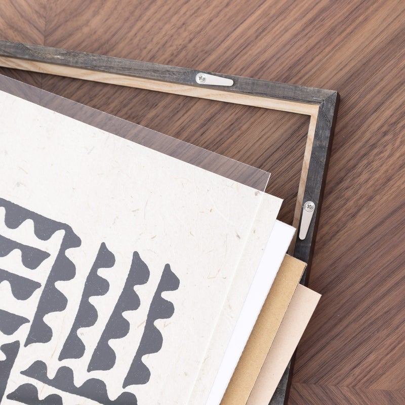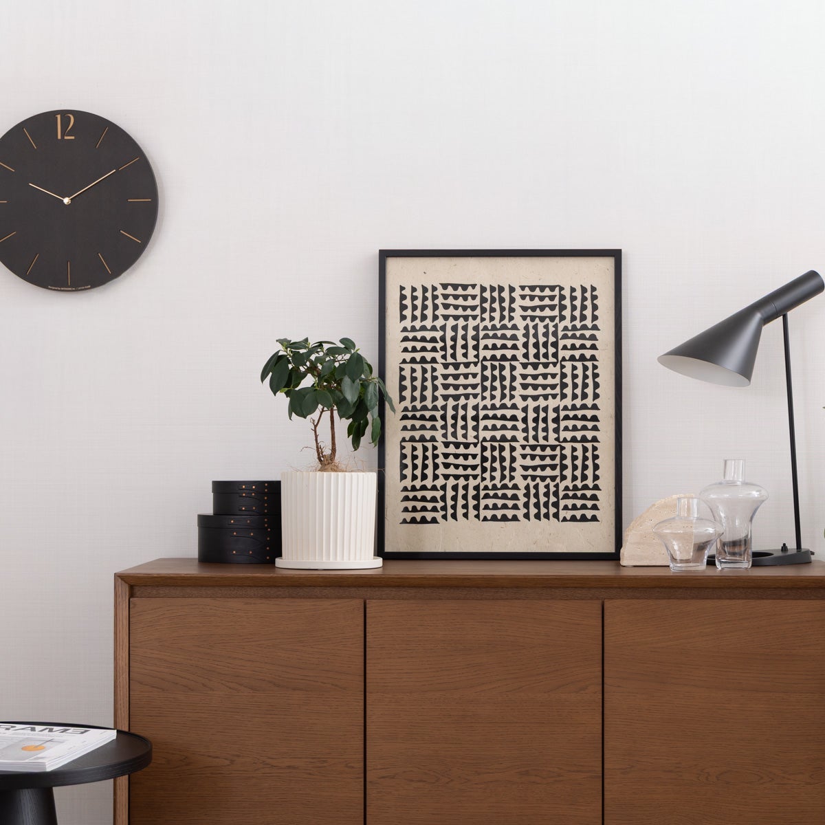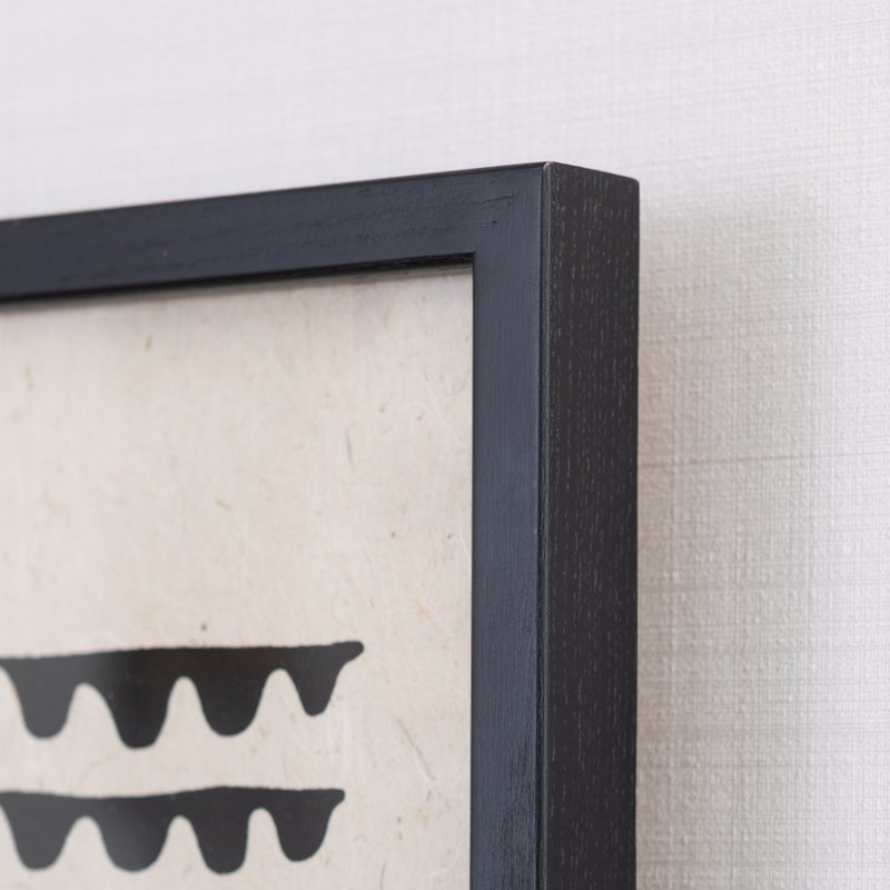 広瀬和紙に、シルクスクリーンで描いた幾何学模様。 うねりや重なりのある線が、空間に静かなリズムを生み出します。 生成りのやさしい風合いと、黒のコントラストが、主張しすぎず、そっと空間になじむアートです。 アートポスターとフレームがセットになっています。