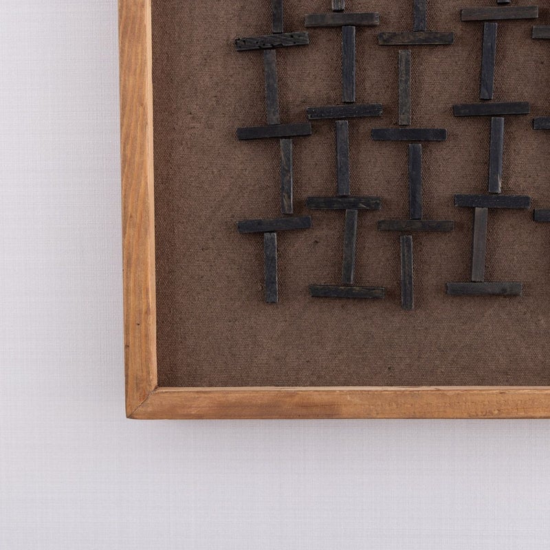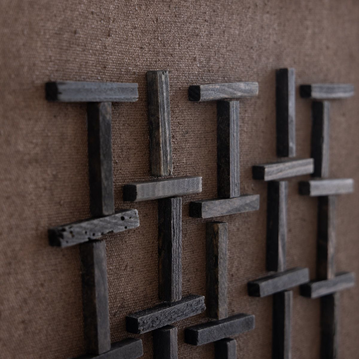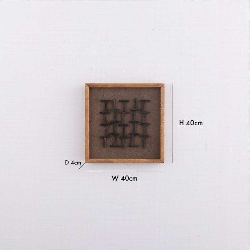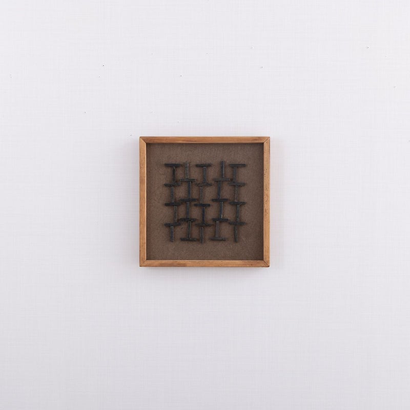 木枠の中に、黒いパーツをリズミカルに配置したアート。 落ち着いた色合いと静かな存在感で、空間にさりげないアクセントをプラス。 シンプルな壁面に飾ることで、お部屋全体の印象を引き締めてくれます。