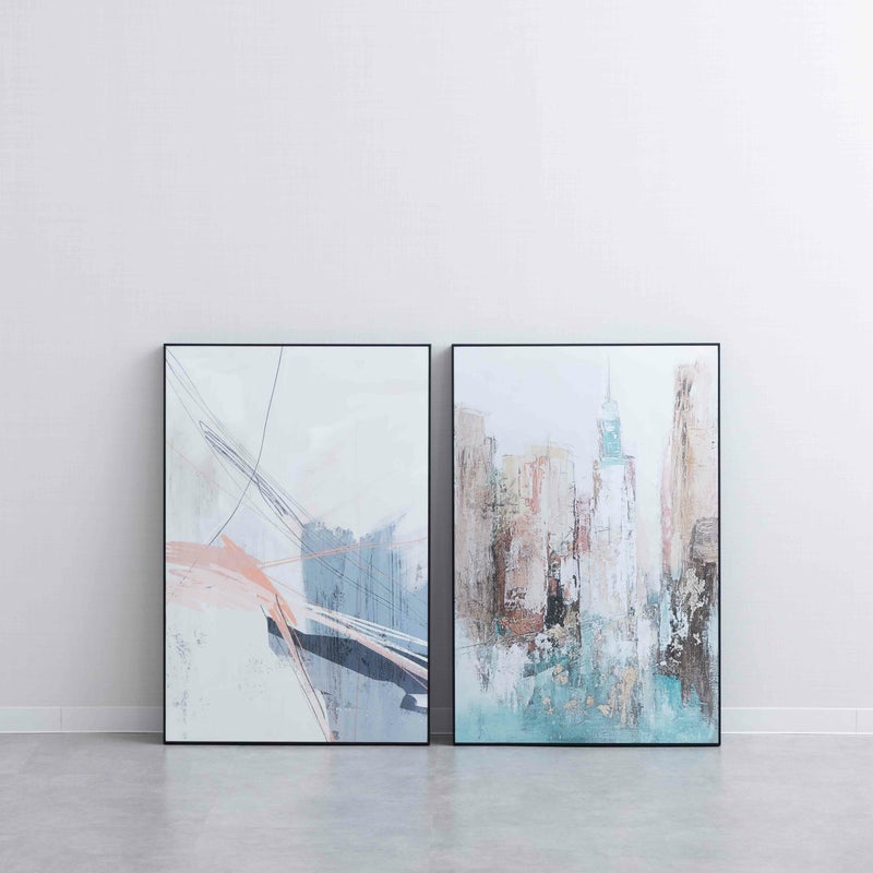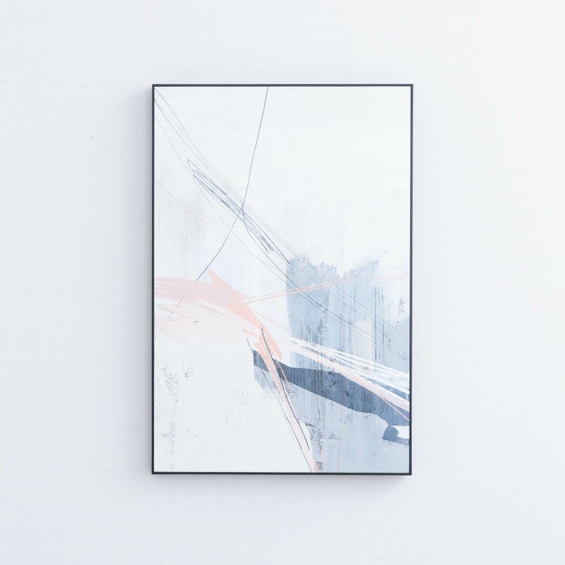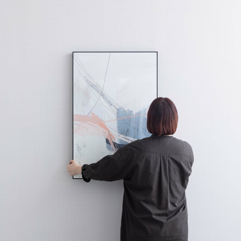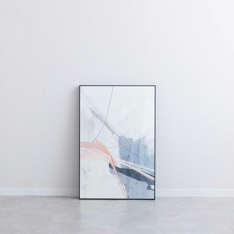 くすみピンクとグレーのやわらかな色彩が、まるで風に揺れるように軽やかに広がるアート。 抽象的な線と余白のバランスが、空間に落ち着きとリズムをもたらします。
