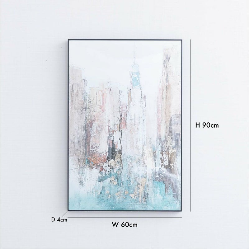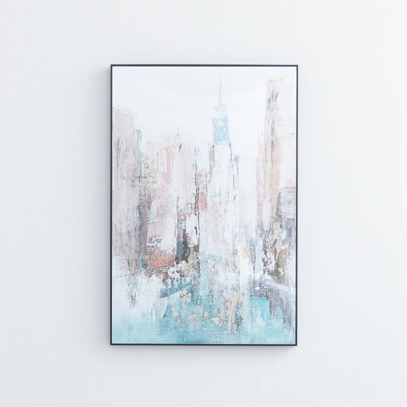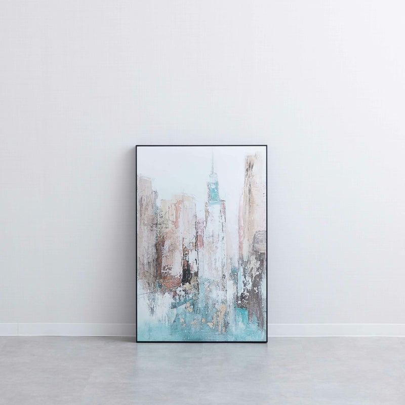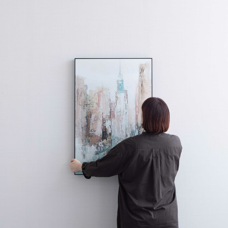 ビルの連なりを思わせるような、抽象的なラインとグラデーション。 くすみブルーの色合いが、空間に落ち着いたおしゃれさを添えてくれます。