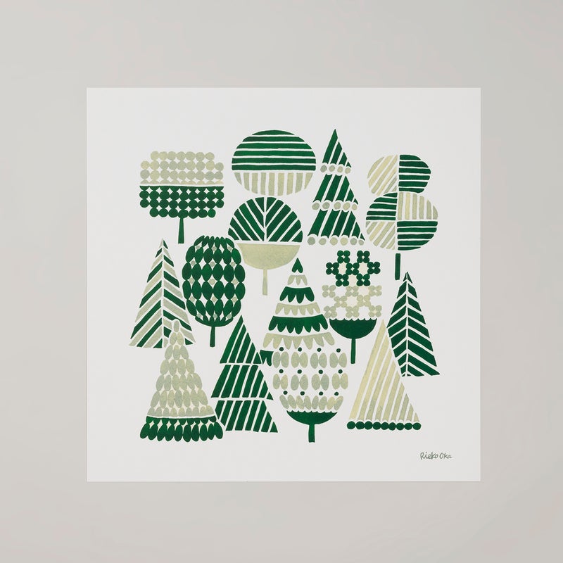 2色で描かれた森の木々を、幾何学模様で表現したアートです。