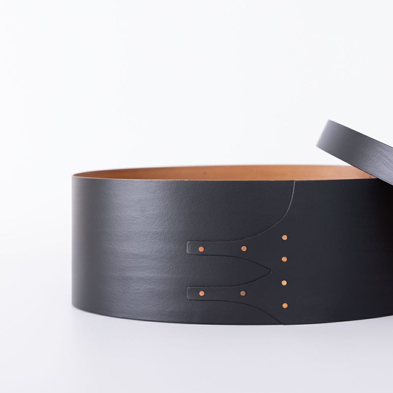 本体は落ち着いたマットな黒色、リベット部分はやわらかなゴールドの銅製で、色の対比が美しく映えます。