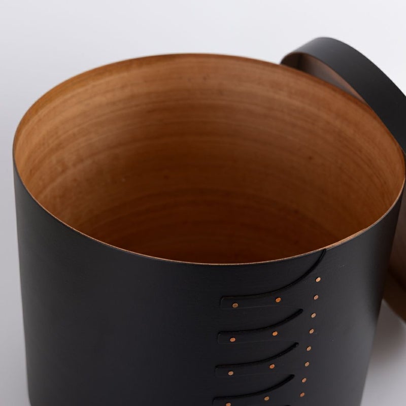 本体は落ち着いたマットな黒色、リベット部分はやわらかなゴールドの銅製で、色の対比が美しく映えます。