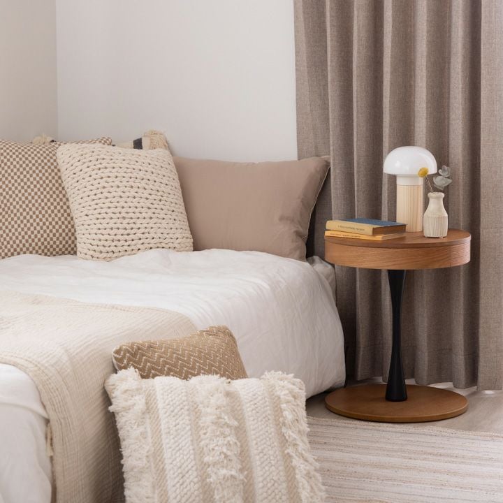 木製のベッドサイドテーブルやサイドボードの上に置けば、ほのかな灯りが空間をやさしく包み込みます。