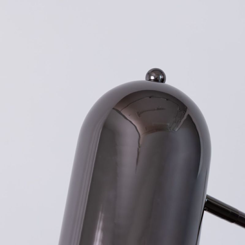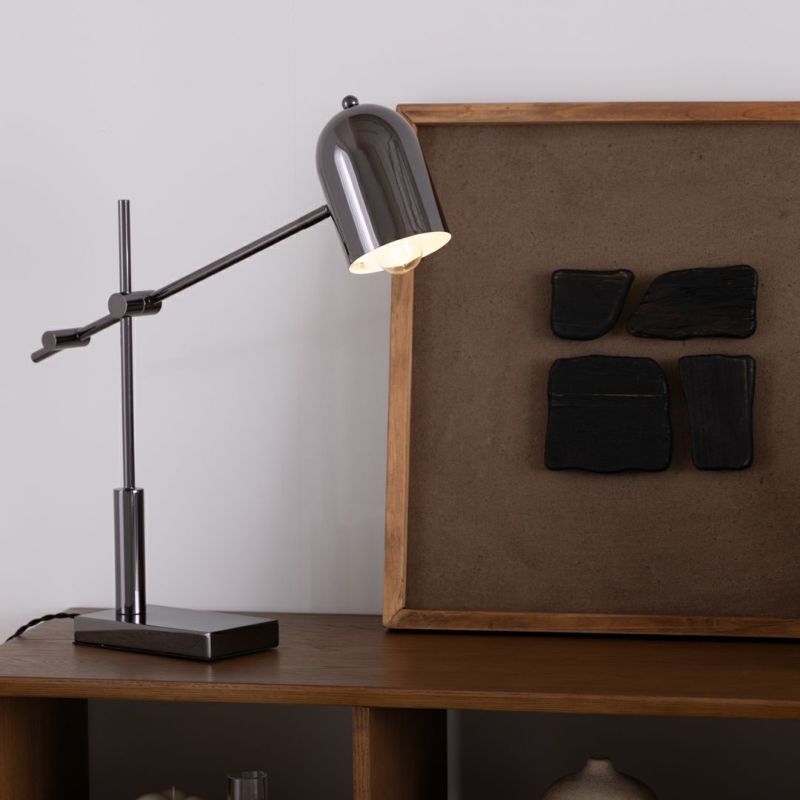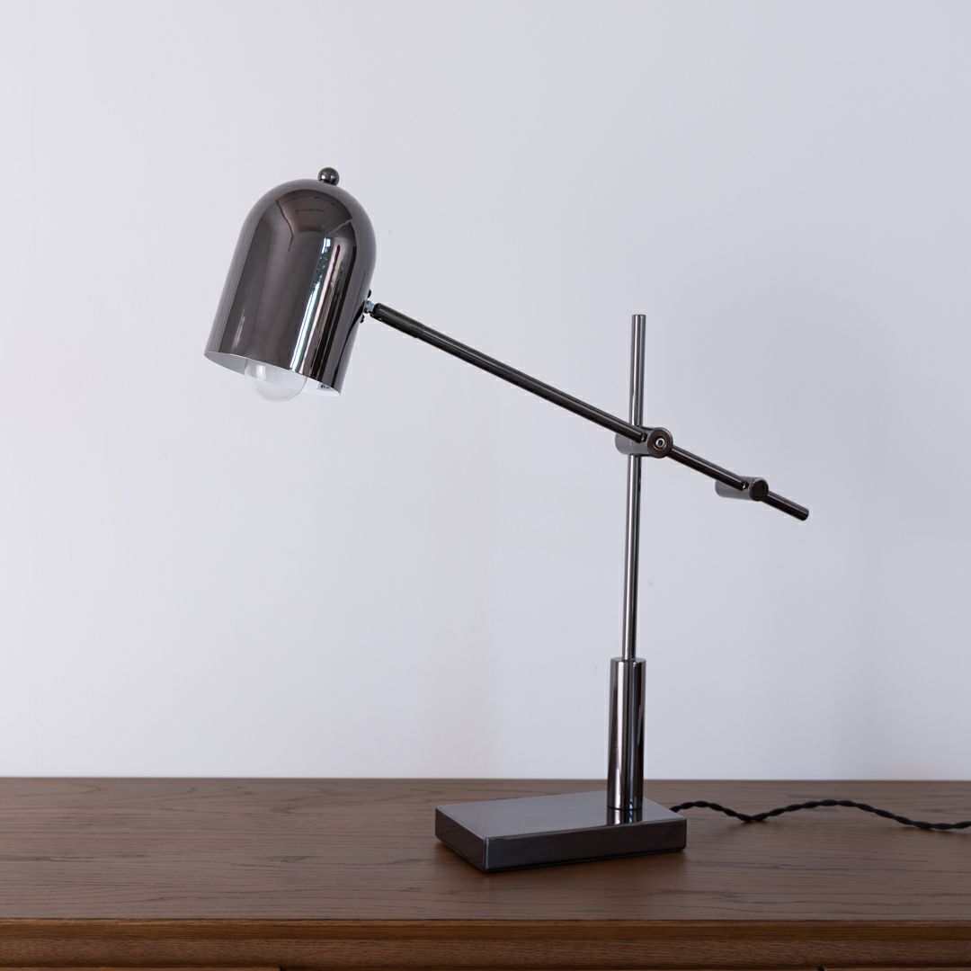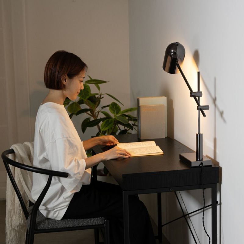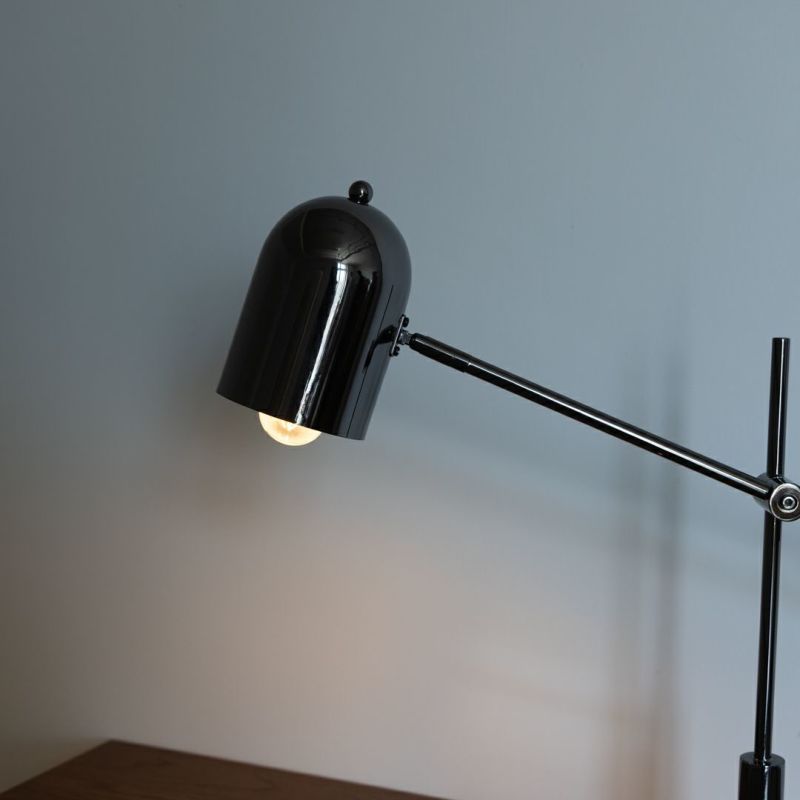 メタリックで都会的な印象ながら、丸いシェードがあたたかみを添えるテーブルライトです。