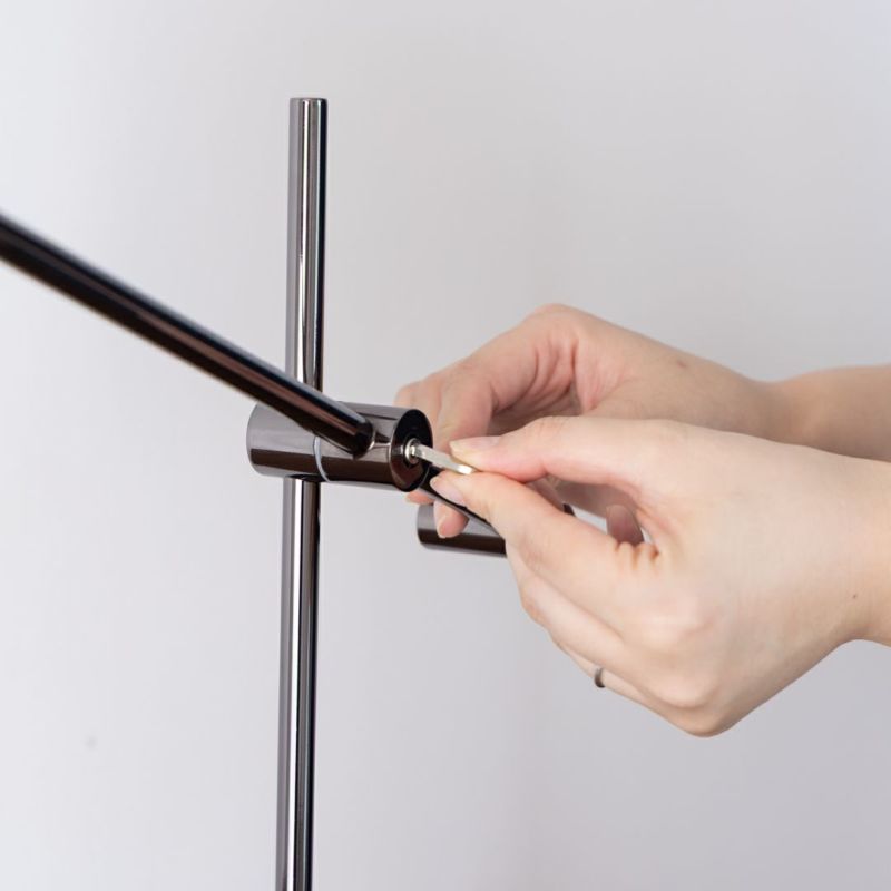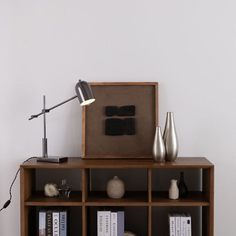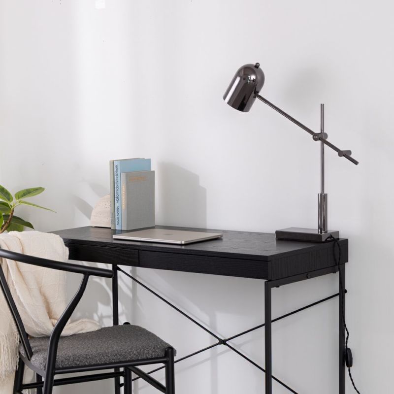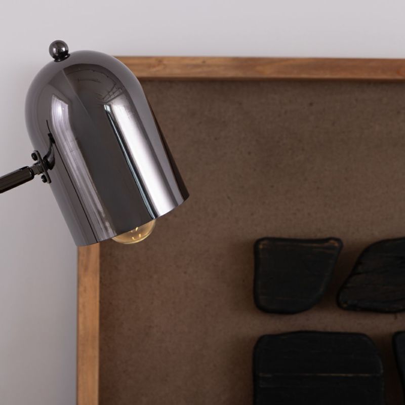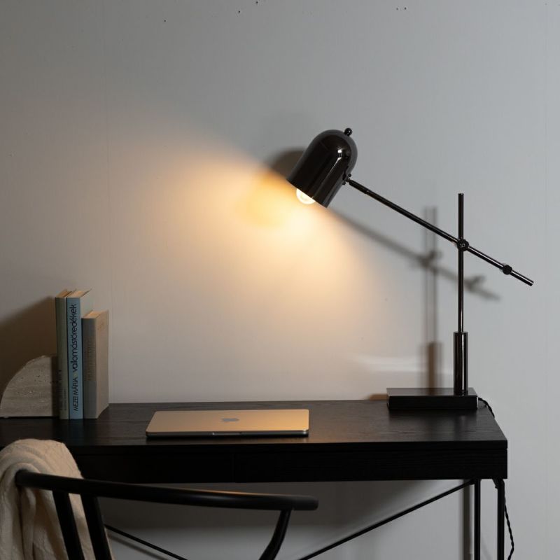 メタリックで都会的な印象ながら、丸いシェードがあたたかみを添えるテーブルライトです。