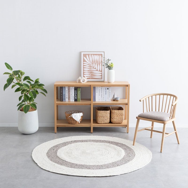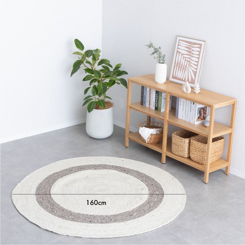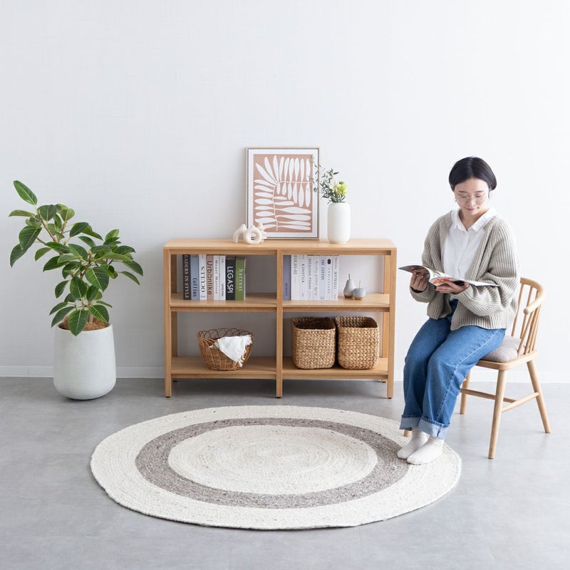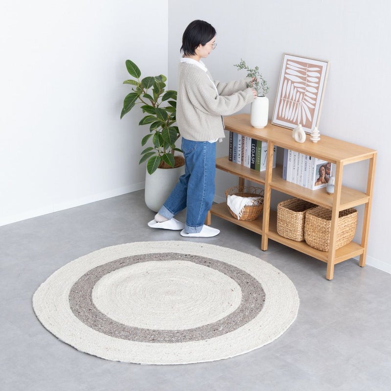 二重丸のようなデザインは、シンプルながらお部屋にアクセントを与えてくれます。 天然素材のウールがあたたかみのあるお部屋を演出。