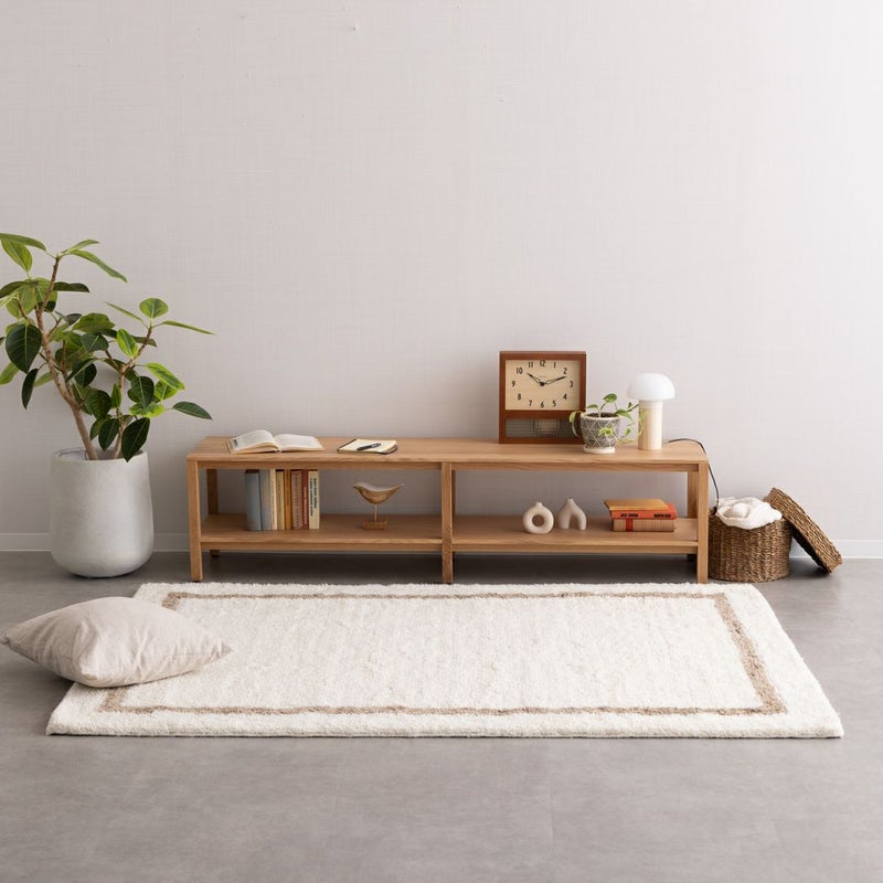 ラグの縁にあしらったラインが、空間にさりげないアクセントを加え、フローリングになじみながらも足元をやさしく引き締めます。
