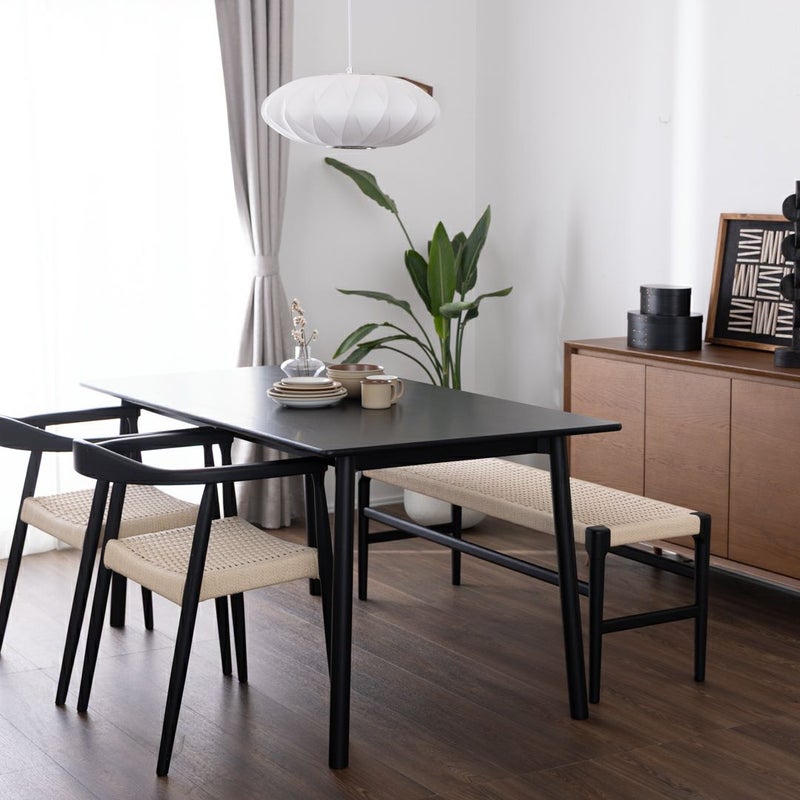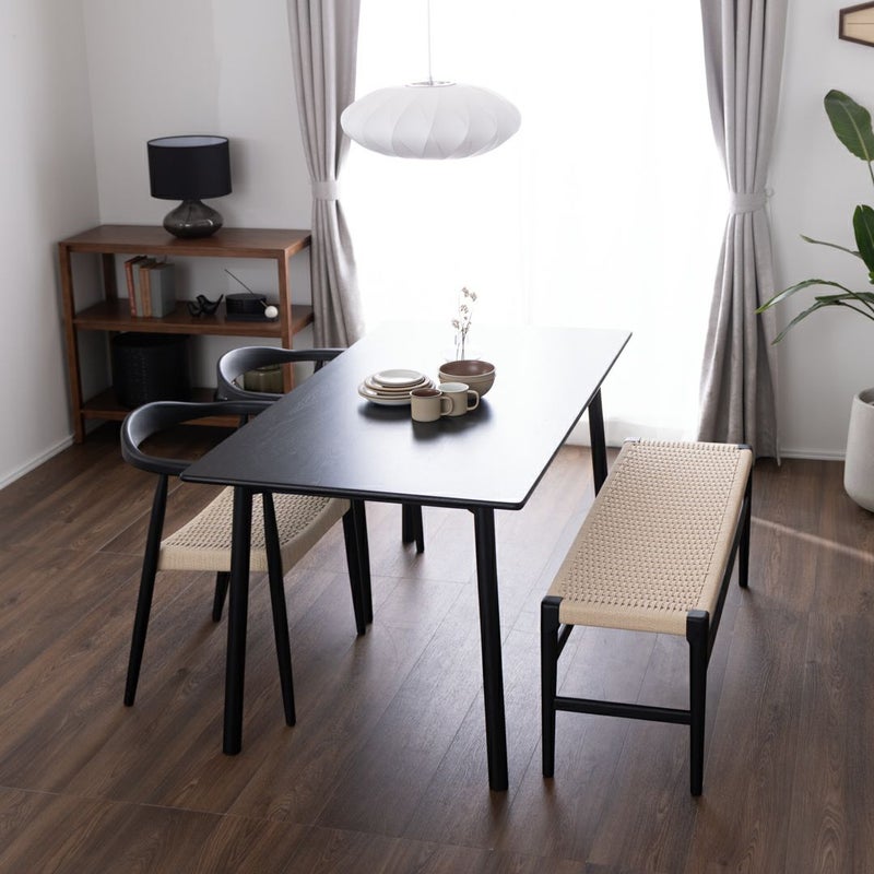 ペーパーコードのチェアとベンチに、すっきりとした佇まいのテーブルを合わせたダイニングセット。
