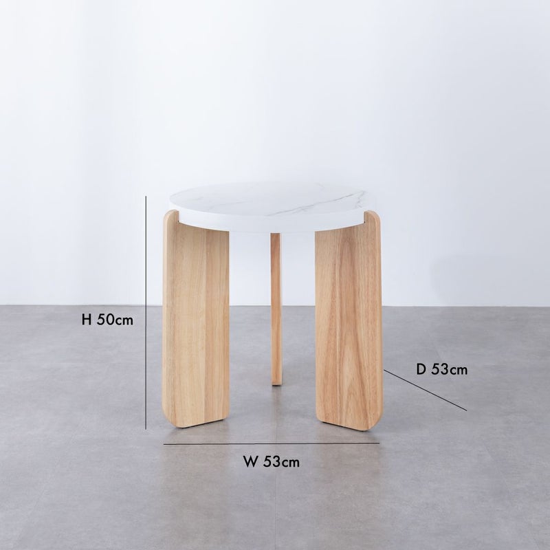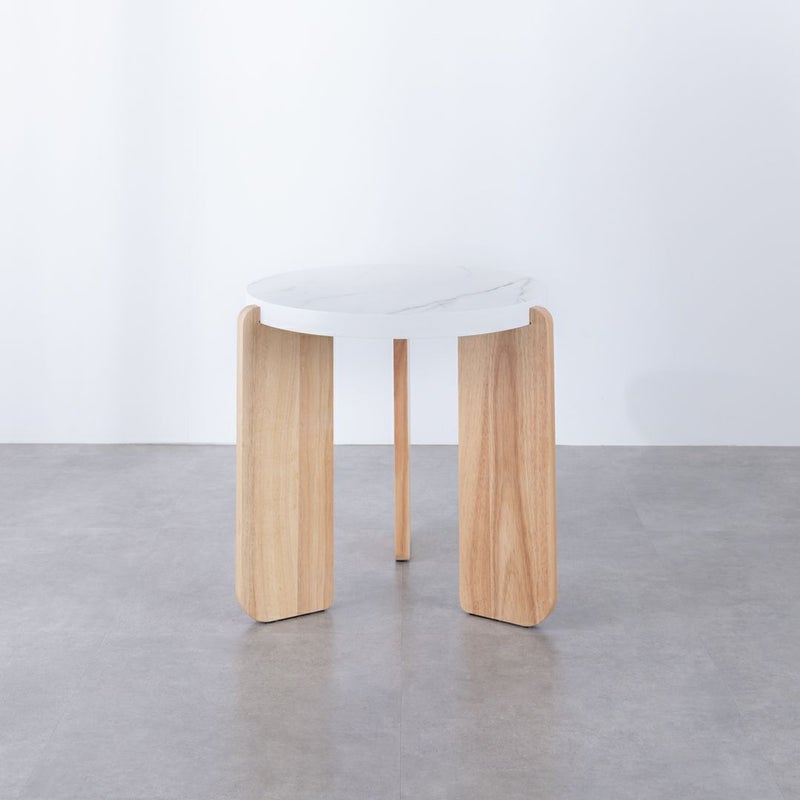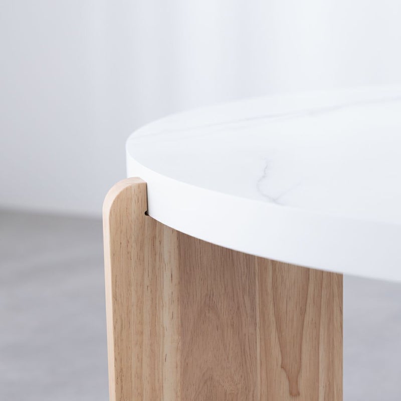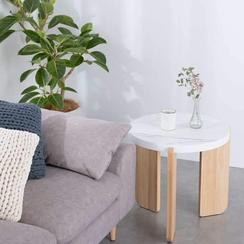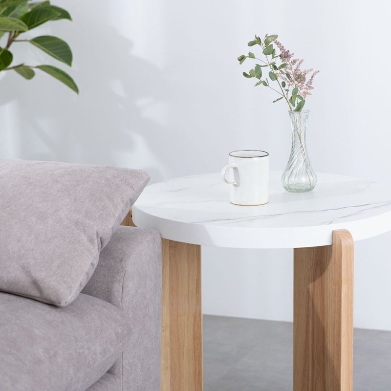 モダンな印象を与える大理石風の天板と温かみのある木製脚を組み合わせた、おしゃれなサイドテーブルです。