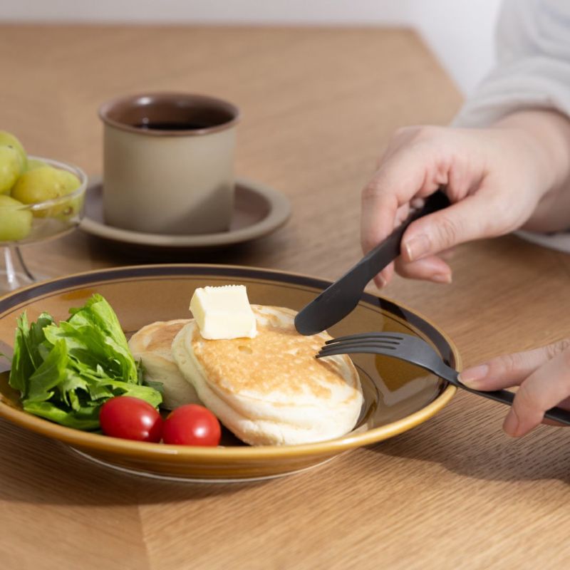 23cmのキャプテンプレートと、スプーンとフォークのカトラリーのセット。 使いやすいサイズ感なので、毎日の食卓で活躍してくれます。