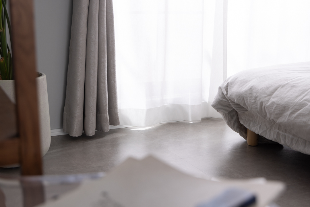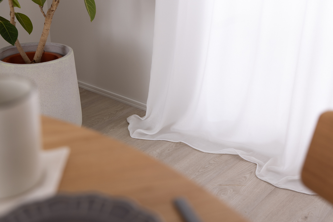 カーテンは、やわらかな手触りのレースカーテン「mellow」をセレクト。シルクのようになめらかで、とろみのある生地が特徴です。