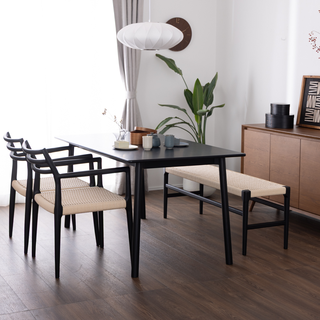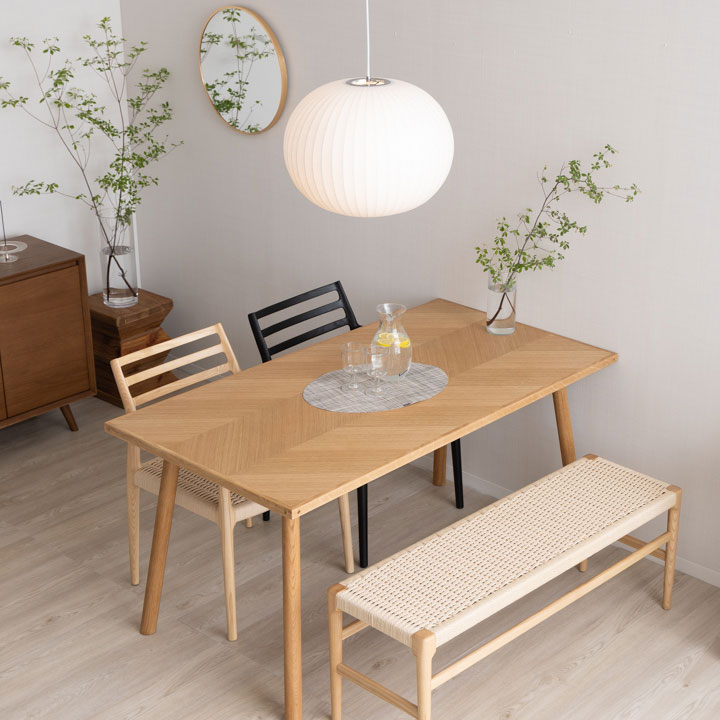 片側にベンチを合わせるレイアウトなら、空間に抜けが生まれ、ダイニング全体をすっきりと見せてくれます。