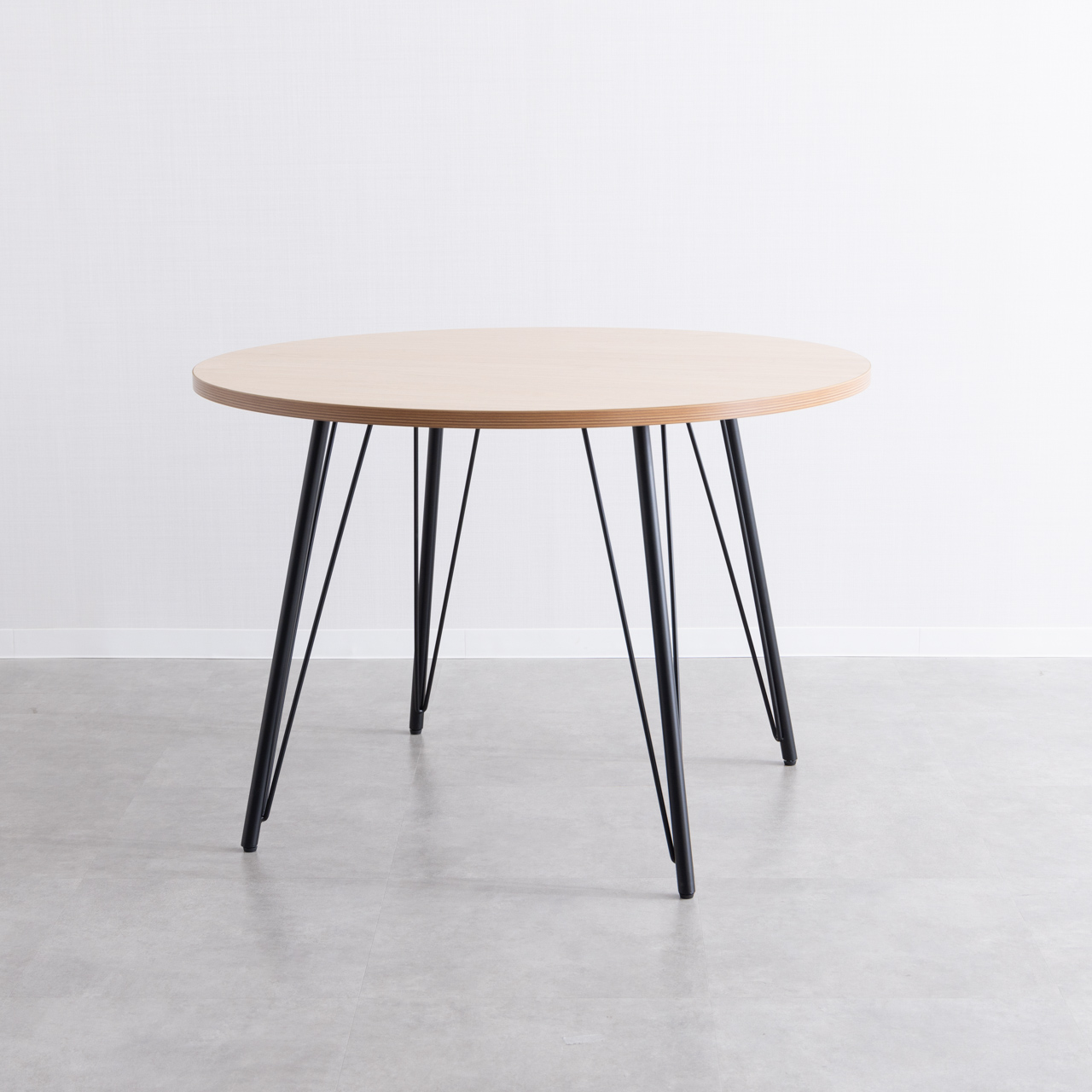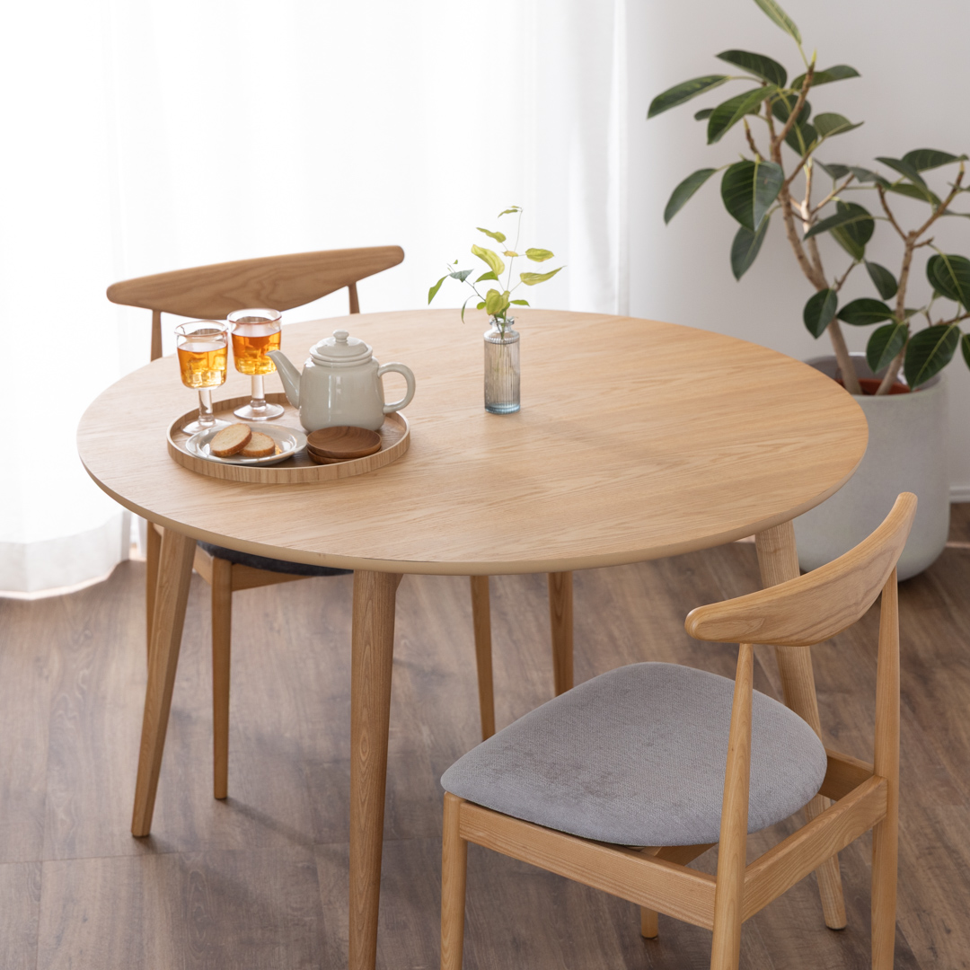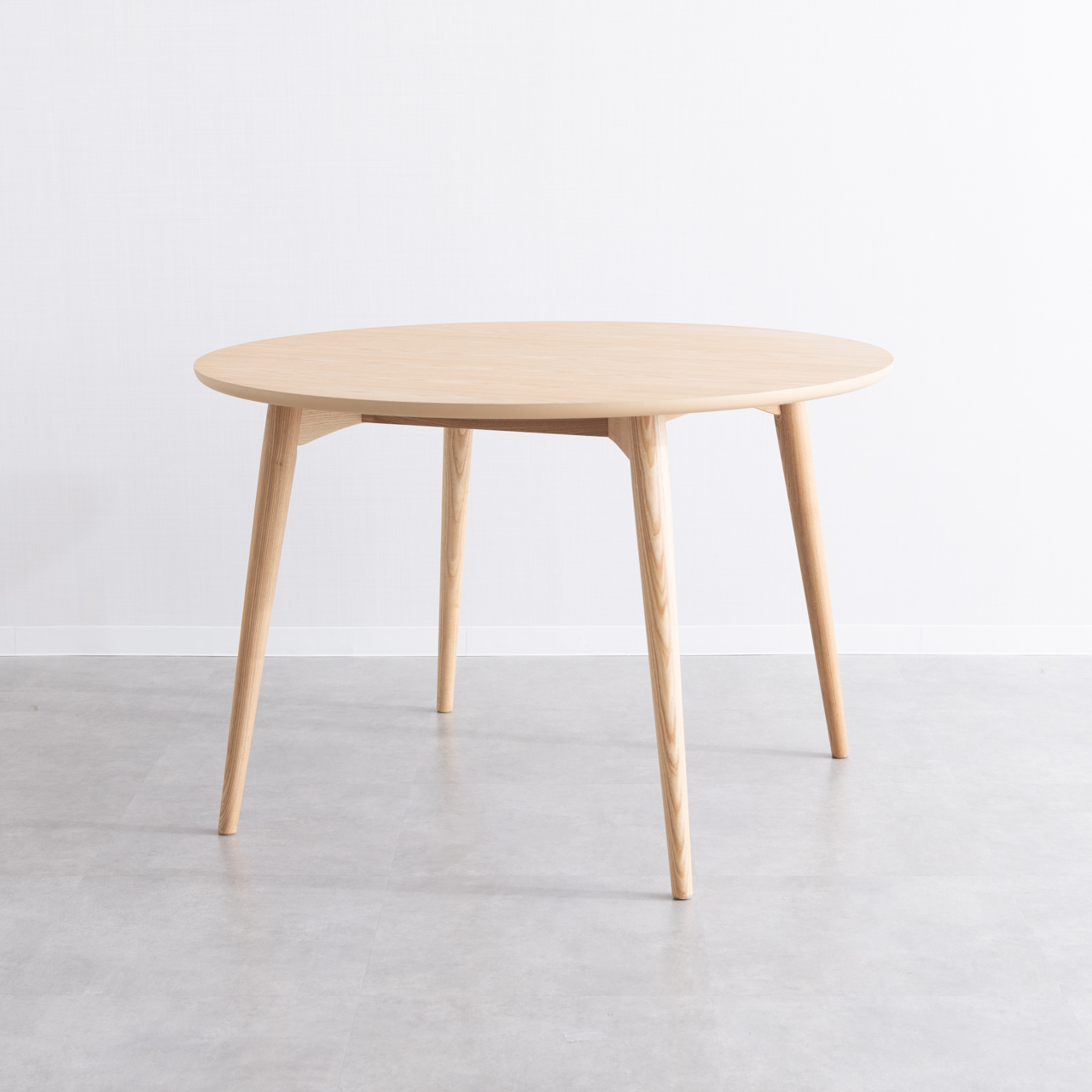 木目のあたたかみを感じる落ち着いた色合いで、長く親しみやすいシンプルなデザインの円形ダイニングテーブル。